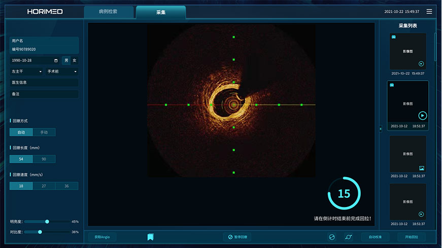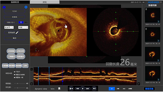 恒宇和藍藍設(shè)計合作,對OCT系統(tǒng)UI操作界面進行了創(chuàng)新,采用的UI界面結(jié)合了16:9寬屏優(yōu)勢,搭載了管腔識別、支架識別、三維重建、造影融合等功能,軟件簡潔直觀的界面和多功能算法可幫助術(shù)者快速精準的做出診療決策,更符合國內(nèi)醫(yī)生界面操作習慣,從而優(yōu)化醫(yī)生和病人的診療體驗。