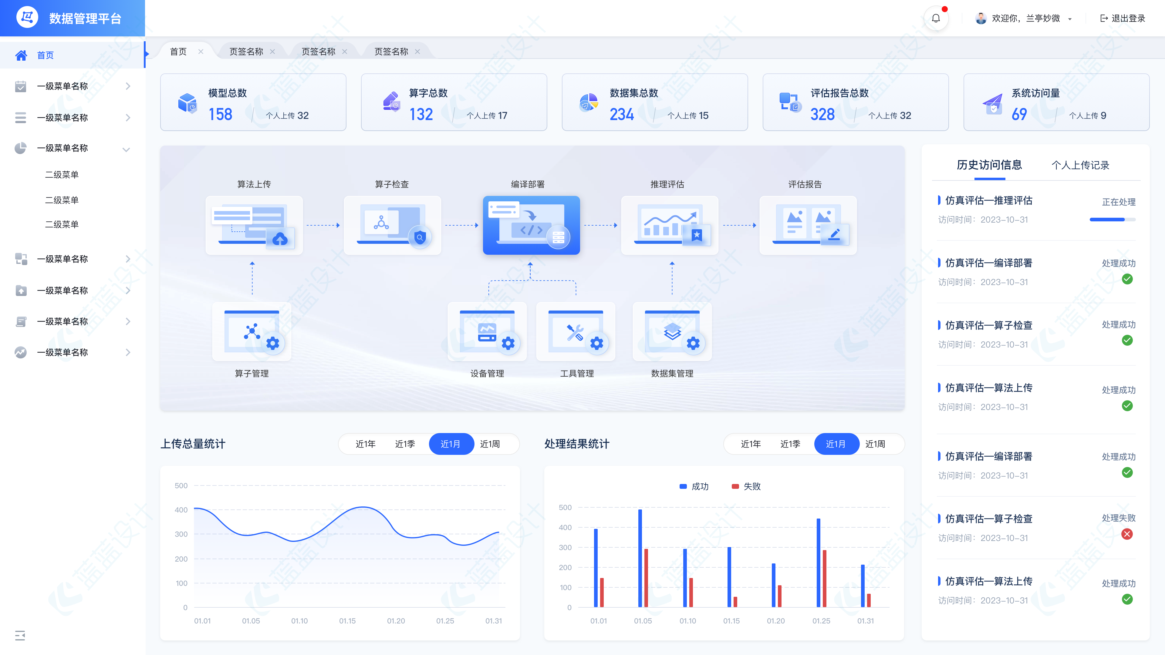 該系統(tǒng)的原首頁中信息量比較少,在設(shè)計時除了對頁面美觀的優(yōu)化,從內(nèi)容、布局、用戶使用場景、使用習(xí)慣、交互方式等方 面也進行考慮,增加了一些統(tǒng)計的圖表, 「歷史訪問信息」采用卡片式列表,突出模塊和內(nèi)容。同時增加「個人上傳記錄」信息和「歷史訪問信息」可以進行 切換查看。