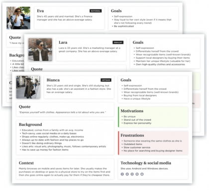 按照我們的邏輯順序,首先是創建角色。我們幾乎在所有項目中都會使用?;谖覀兊漠a品或服務的目標群體,即不同的潛在客戶,構建虛構人物個性。這個工具可以讓我們更多地了解客戶的需求、問題、動機和行為。我們通過研討會、頭腦風暴或通過定性和定量研究“簡單地”收集盡可能多的數據來實現這一目標。
