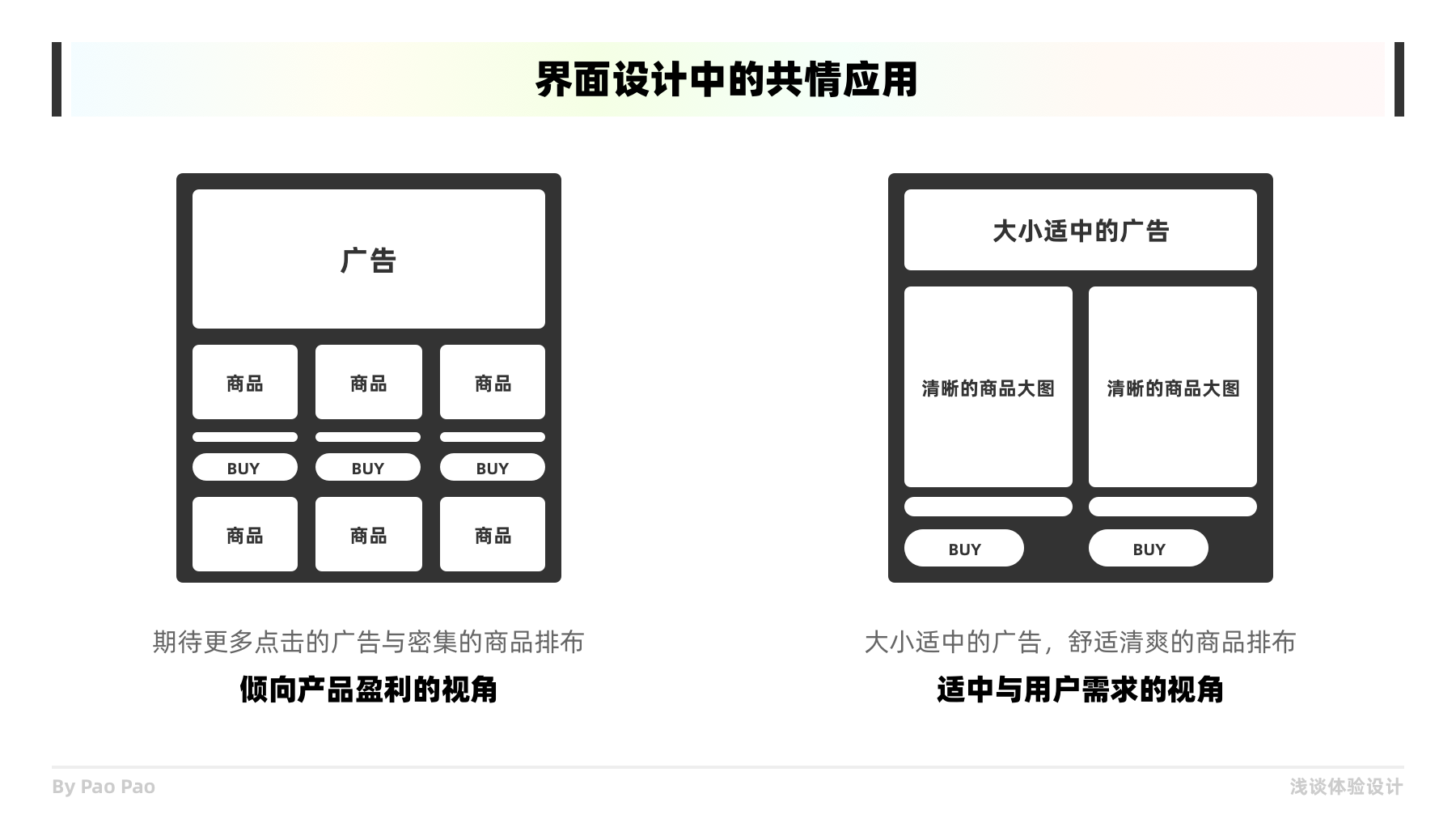 對于“共情”我更多的理解成是兩個或多個載體之間的一種共識一種情緒共鳴,然后再到行為跟思維上的影響。但實(shí)際上發(fā)生完全的共情是不可能的,有時連我們自己也會做一些無法理解的迷惑行為,并且客體是多樣化的,可以是跨物種的,跨維度的。而我們要做的就是在工作中定義共情的有效范圍,盡可能的與目標(biāo)用戶產(chǎn)生共情以了解更多信息或需求,然后去定義和構(gòu)思新的需求與設(shè)計(jì)。共情很重要,但它不是設(shè)計(jì)工作中的全部,有效而不要過度的使用也很重要。