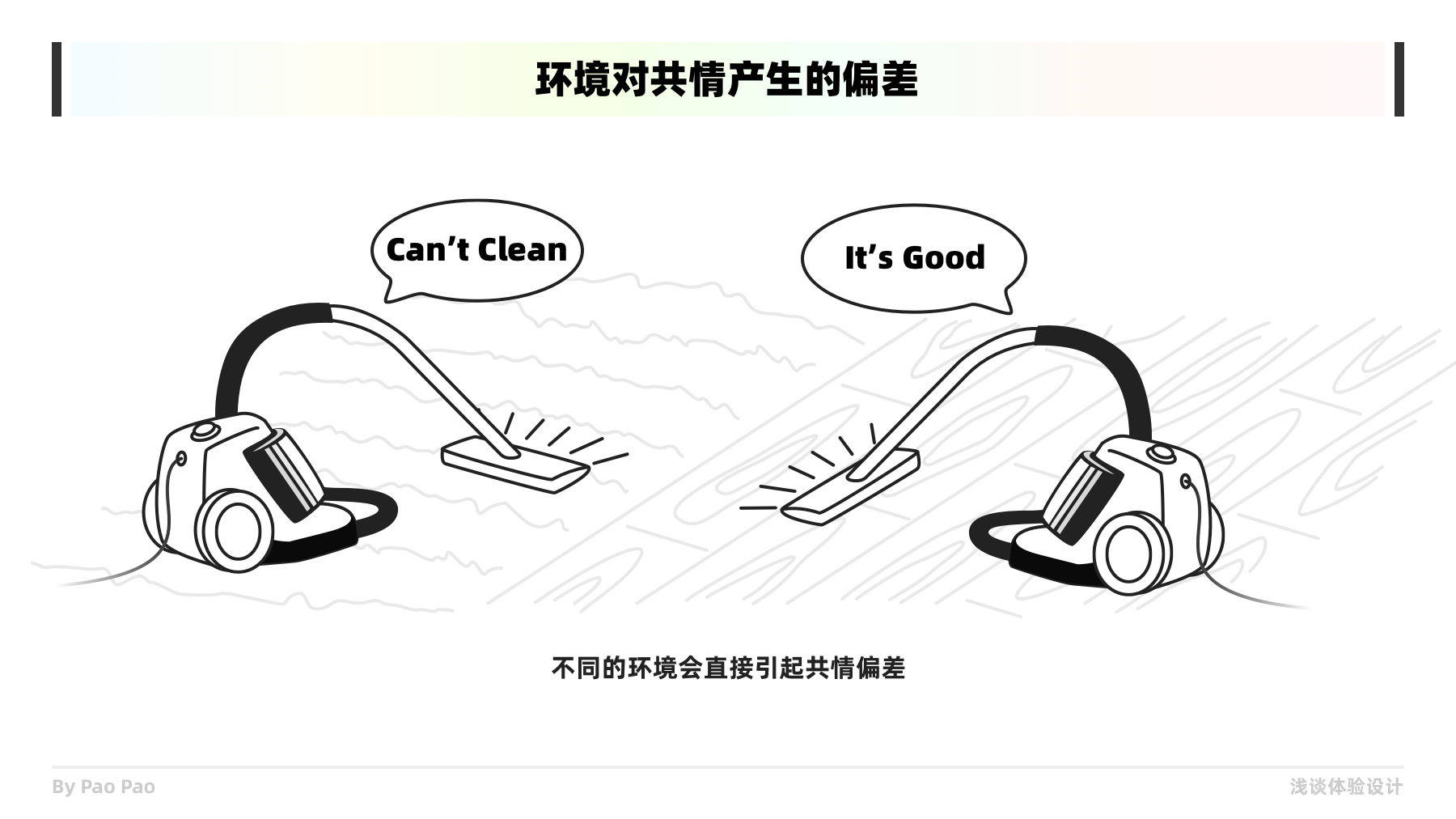 在體驗(yàn)設(shè)計(jì)的過程中,我們需要與目標(biāo)對象構(gòu)建共情時,一定是有目的有意圖的。以使用性測試為例,往往我們都會設(shè)定一些產(chǎn)品測試任務(wù)和目標(biāo)給用戶,再進(jìn)行觀察和共情。這也將允許我們能夠在同一個或相似的場景事件中發(fā)生共情,這樣才能夠獲取到更真實(shí)有效的共情。以一個吸塵器產(chǎn)品為例,如果對方是在地毯上測試的,而你是在木質(zhì)地板的環(huán)境下去共情的,那么共情結(jié)果肯定是有所出入的。所以構(gòu)建一個共情目的甚至是環(huán)境是有效共情的一個重點(diǎn)之一。
