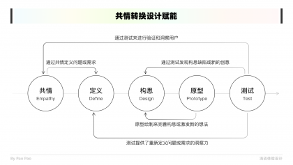 最后便是共情結(jié)果如何應(yīng)用到設(shè)計(jì)之中,將共情結(jié)果賦能到產(chǎn)品設(shè)計(jì)也是共情工作的價(jià)值所在。通常這套流程是共情->定義->構(gòu)思->原型->測試,在這個整個過程中隨時是可以返回到前面其他階段中反復(fù)打磨的,而共情作為一個起點(diǎn)也揭示了其重要性。我們一切的共情工作皆為了能夠優(yōu)化和解決產(chǎn)品的問題,使得產(chǎn)品體驗(yàn)?zāi)軌蚋茫@是我們在體驗(yàn)設(shè)計(jì)中不斷去共情的初衷。