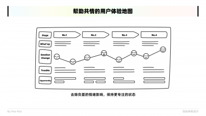圖表、筆記、錄制設(shè)備是幫助我們共情的最好工具,在不同的場景下,這些工具能夠幫助我們更好的收集信息,并且便于我們思考和共情。我們在短時間能記住的信息是有限的,這也是為什么我們會用到7±2這種定律去控制信息量的原因。以用戶體驗(yàn)地圖為例,在記載用戶體驗(yàn)產(chǎn)品的過程中,便是一種很好的共情輔助工具,它能夠按照使用步驟或階段記載用戶使用情況和情緒變化等反饋。