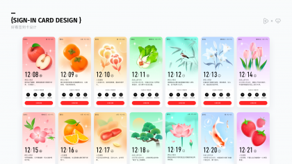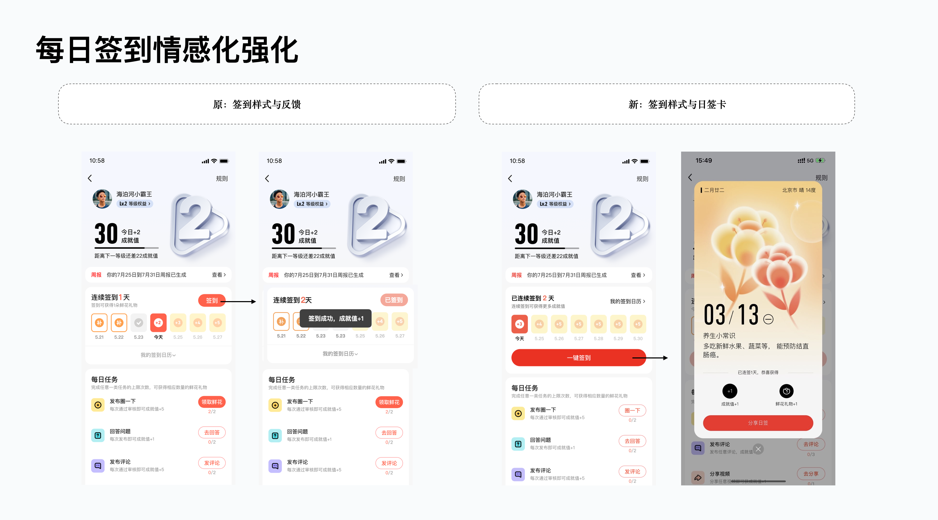 等級中的簽到是最易完成任務類型,部分老用戶始終堅持簽到,甚至達到百日以上,表明簽到系統確實能促進用戶留存。因此設計上強化了簽到按鈕與簽到后的反饋,并衍生出了新的簽到反饋——日簽卡。日簽卡以彌散清新的風格進行對應設計,配合常用的花卉、食材等圖案、文案分別對應中年人愛看的人生感悟、養生常識、歷史上的今天,溫馨感十足,上線后還吸引了大量用戶分享保存日簽卡,極大的提升了簽到用戶的次日留存。