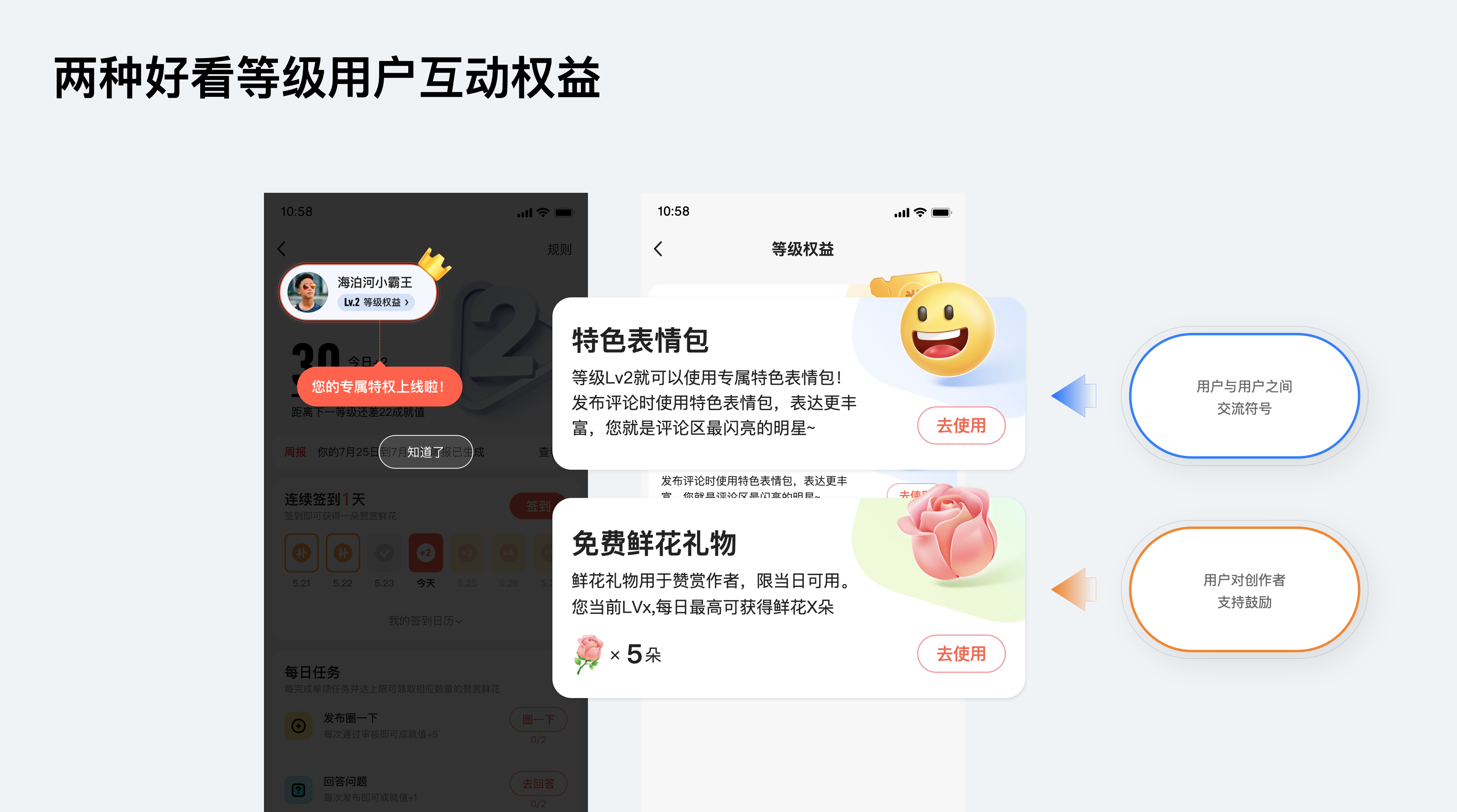 鮮花禮物特權方面:當用戶升級及完成任務的同時可領取該獎勵,我們采用用戶比較熟知的“授人鮮花,手有余香”的概念,等級越高可獲得更多鮮花,越能鼓勵作者,增進了創作者與忠實粉絲之間的關系。免費禮物是好看視頻的首創,雙向促進用戶與作者激勵,后續其他平臺也進行了功能跟進。在作者的帶動下,當用戶想給作者贈送鮮花時為了獲取更多的鮮花,也能導流到任務系統促進等級任務的完成。