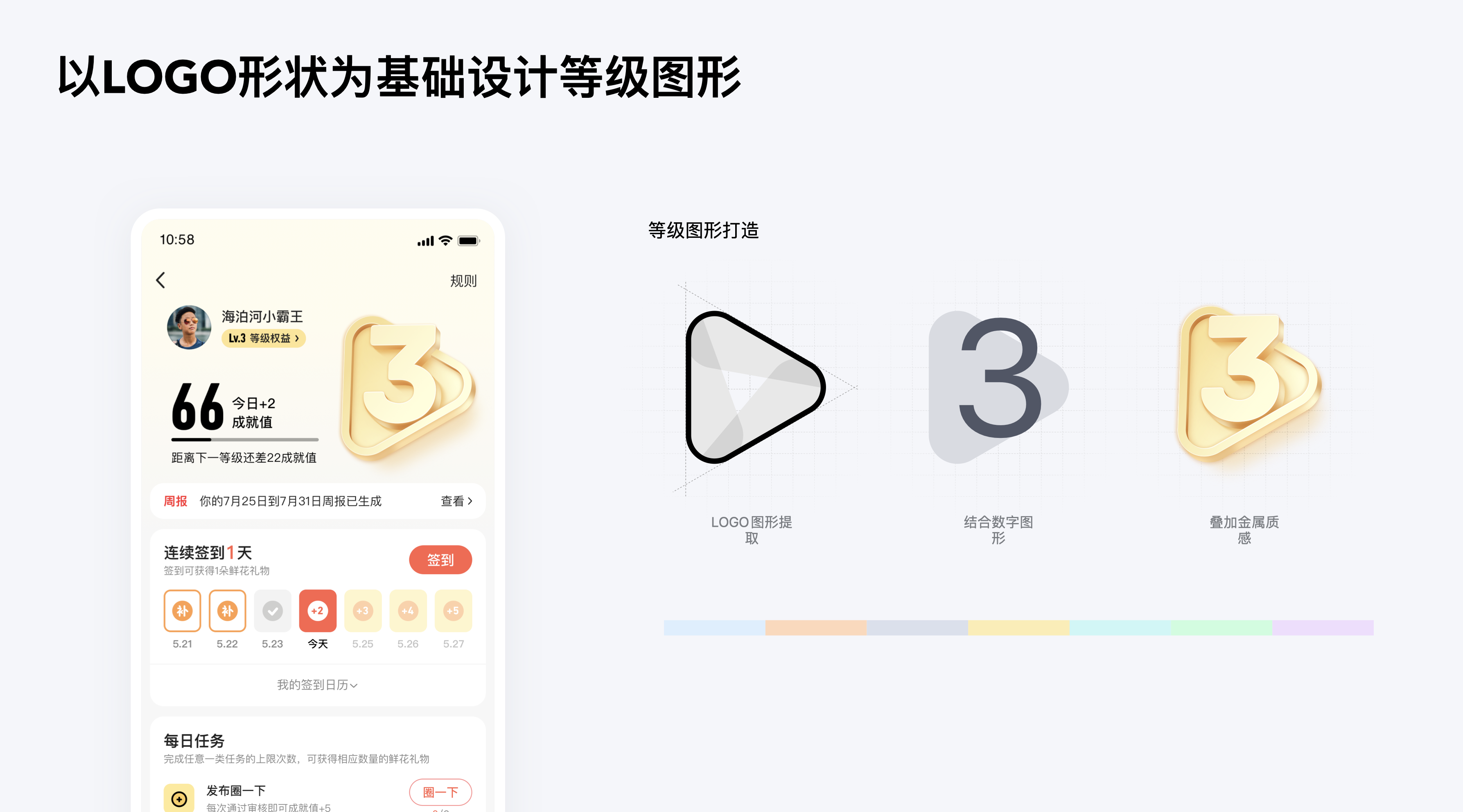 整體等級框架由用戶身份等級展示、每日簽到、每日任務三個部分,以成就值為基數指標,通過完成每日簽到與每日任務積累成就值,達到一定的數值即可完成升級。