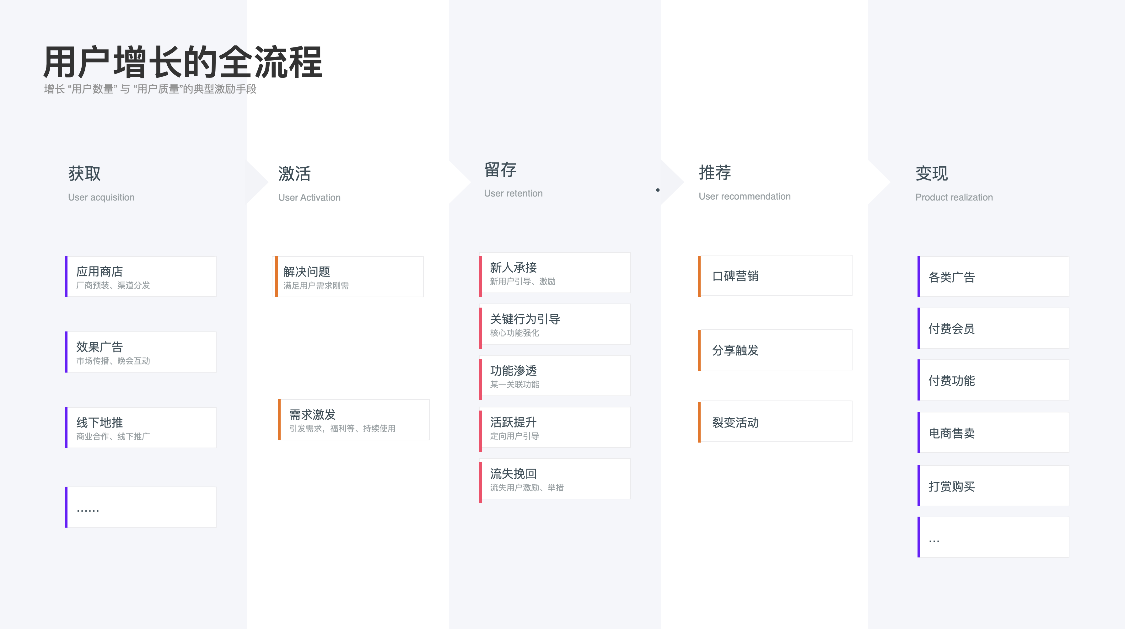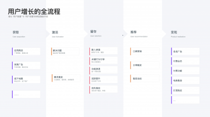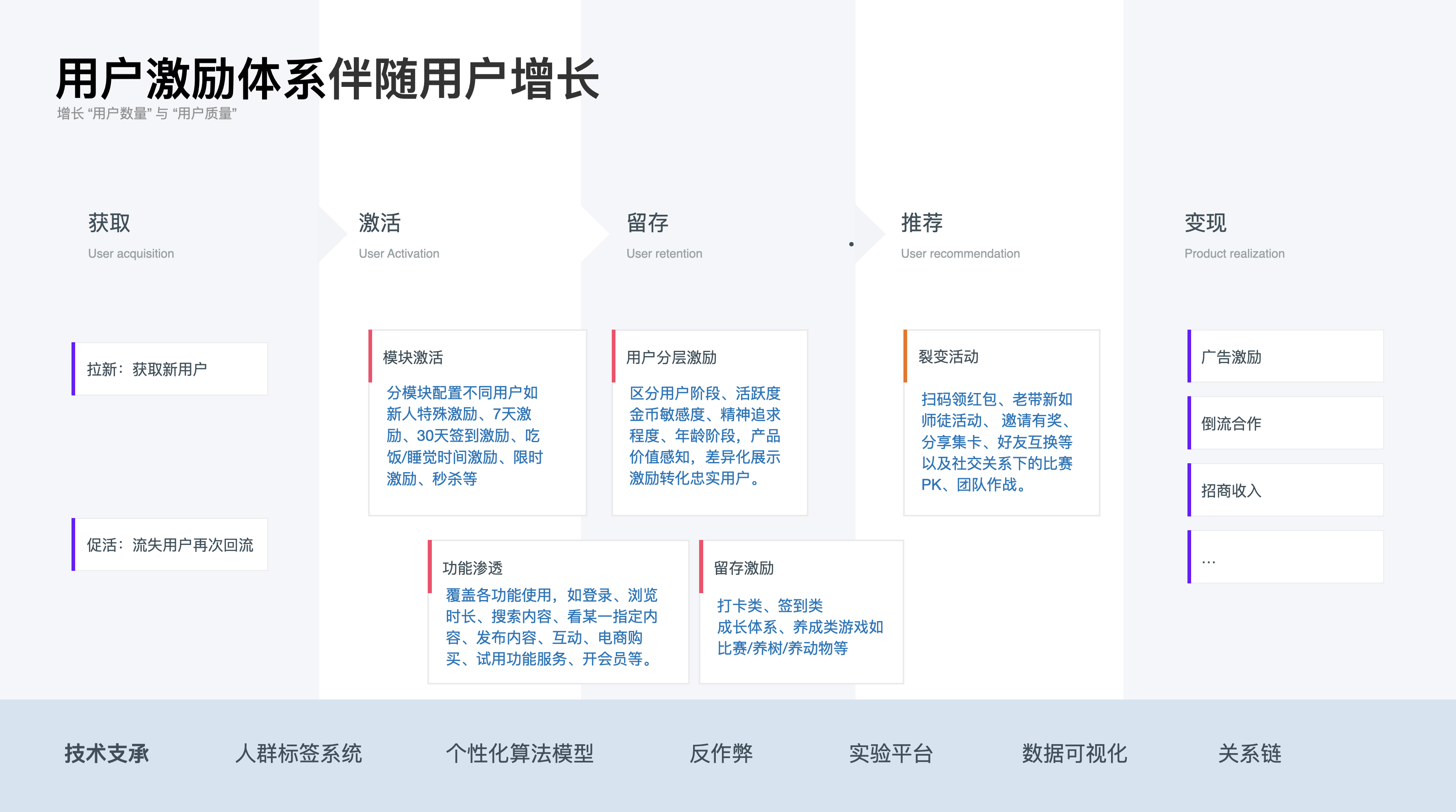 以上是用戶視角下的激勵體系,下面講講產品業務下的激勵體系的作用,通常情況下激勵體系伴隨著用戶增長的全流程“獲取—激活—留存—推薦—變現”各個過程。用戶增長代表著增長“用戶數量”與“用戶質量”,以上三類激勵方式都會在產品增長的各流程中承擔著不同程度的促進作用: