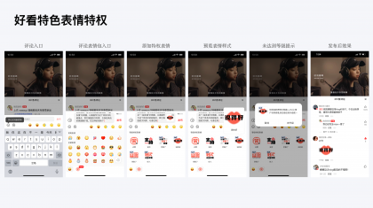 特權表情方面:我們通過評估5w條好看視頻評論數據,選出高頻關鍵詞10條,同時投放到社群用戶中進行投票選舉,宣出我們用戶最更偏愛的交流詞匯,最終選出6個表情包文案:支持、點贊、厲害了、說得好、學到了、好人一生平安。隨后開始根據這五條內容進行表情圖案創作,打造具有好看特色、正向有梗的視覺系統。好看用戶下沉且年齡較大,對醒目直白、突出重點、易讀易懂的設計更偏愛。因此圍繞文字繪制了一套簡單明確又具備詼諧感的表情包圖案,在用戶傳播上也能更易傳播,更能能打造好看品牌的互動記憶點。