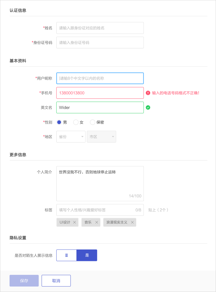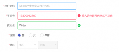 當(dāng)輸入有誤時(shí),盡量避免彈出框提示,可以直接對(duì)輸入框設(shè)計(jì)不同的狀態(tài)顯示默認(rèn)狀態(tài)、選中狀態(tài)、錯(cuò)誤狀態(tài)、成功狀態(tài)。