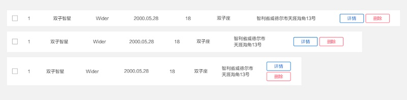 當(dāng)寬度拖到第三種情況,按鈕也出現(xiàn)了換行,那每一行的高度都應(yīng)該按照這個(gè)高度保持一致,即使有一些數(shù)據(jù)只有一個(gè)按鈕/地址并沒(méi)有出現(xiàn)換行,如圖: