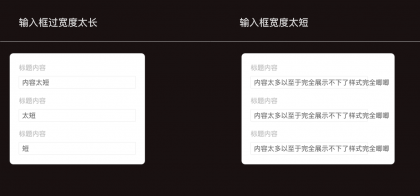 采用這樣的處理方式時(shí),需要控制表單內(nèi)輸入內(nèi)容的長(zhǎng)度高度一致,不然會(huì)面臨以下兩種尷尬:面對(duì)尷尬一(長(zhǎng)度定太短)內(nèi)容擴(kuò)展性太差,無法同時(shí)滿足大段信息展示。面對(duì)尷尬一(長(zhǎng)度定太長(zhǎng))輸入框當(dāng)只填寫一兩個(gè)字符時(shí),會(huì)很空視覺效果不佳。