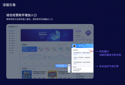 浮層:將操作入口前置披露,提升商家感知同時還可以縮短操作步長。在商家等級項目里,衡量商家主動經(jīng)營的標準是做任務,所以任務入口的前置披露是提升主動經(jīng)營的關鍵舉措。于是,圍繞商家等級包裝了“經(jīng)營助手”的概念,幫助平臺給商家推薦一些成長任務和優(yōu)化建議,并在平臺首頁主動彈出,以此提高任務觸達率。但使用這種主動觸達手段時,需要考慮對商家的打擾和阻斷情況,所以需要對主動彈出的頻率作限制,然后配合氣泡和標簽等視效元素吸引商家視線。這樣可以引導商家參與商家等級完成任務,促進其成長和等級提升。