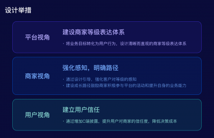 設計的基本出發(fā)點是幫助業(yè)務建設平臺等級模型的表達體系,將業(yè)務目標轉(zhuǎn)化為用戶行為,設計清晰而直觀的商家分層表達體系,將不同商家等級與其對應的特權、服務等信息進行明確的關聯(lián)和傳達,以便商家能夠快速理解和辨識商家等級的差異和優(yōu)勢。