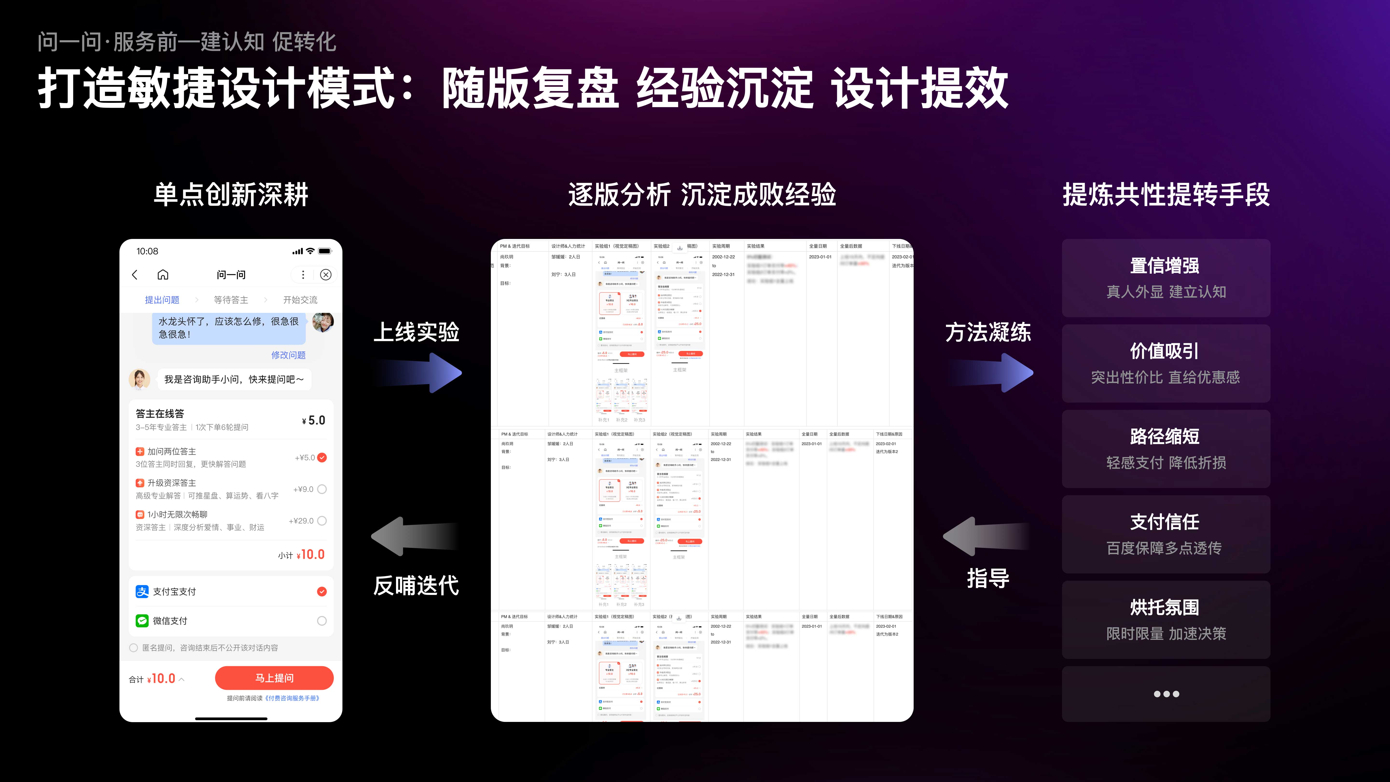 ?為了進(jìn)一步提升設(shè)計效率,我們將提問頁的迭代歷史進(jìn)行線上化記錄,并組織團隊定期復(fù)盤總結(jié),提煉出「真人外顯-增強置信感」「優(yōu)惠直給-突出性價比」「路徑縮短-弱化支付感」等一系列通用的提轉(zhuǎn)手段;又將這些手段復(fù)用到服務(wù)上下游環(huán)節(jié)的同類場景中,通過系統(tǒng)化提轉(zhuǎn),有效幫助業(yè)務(wù)訂單量、GMV大幅提升。
