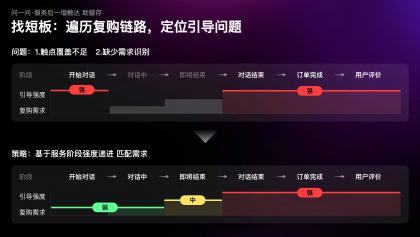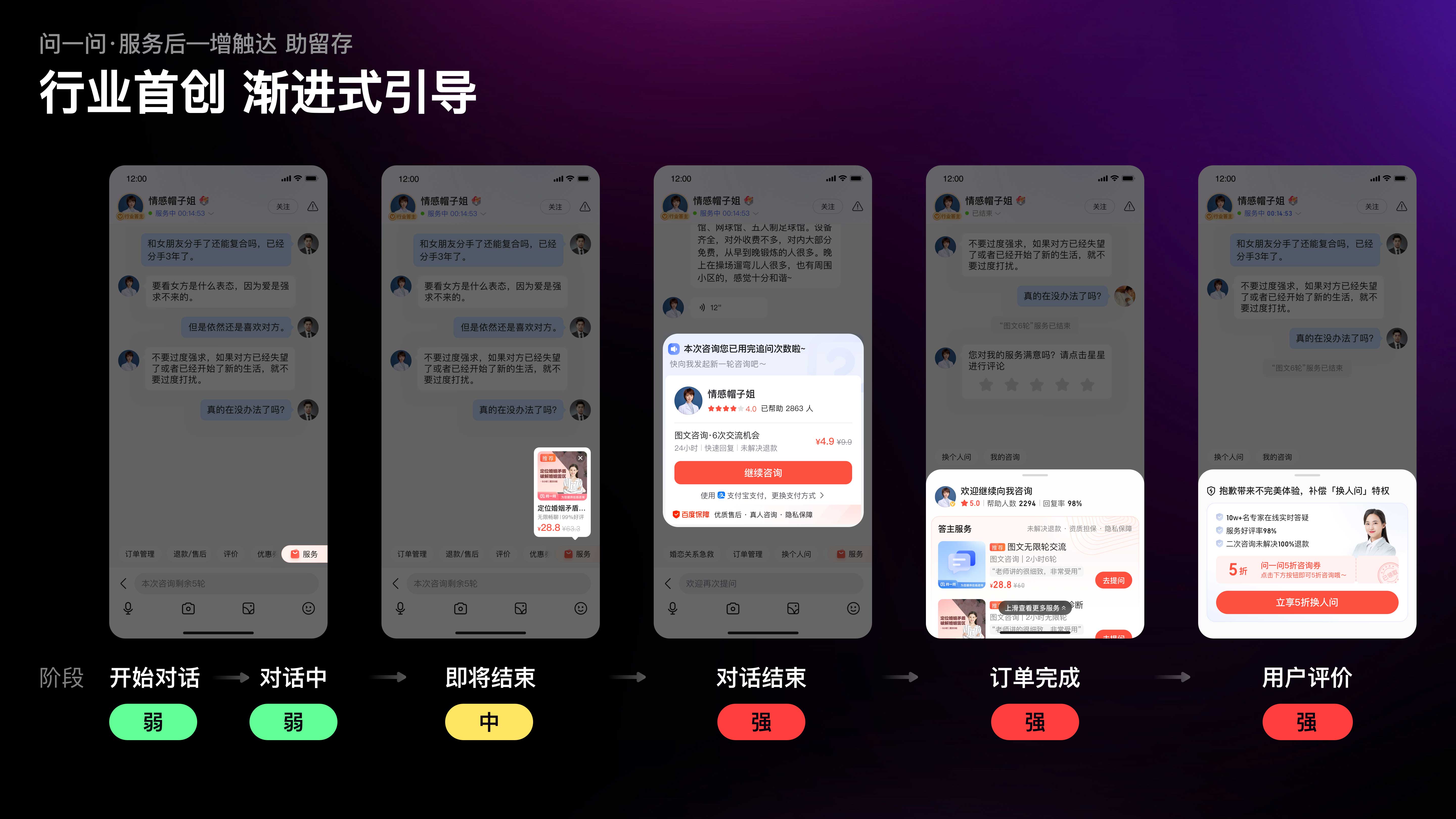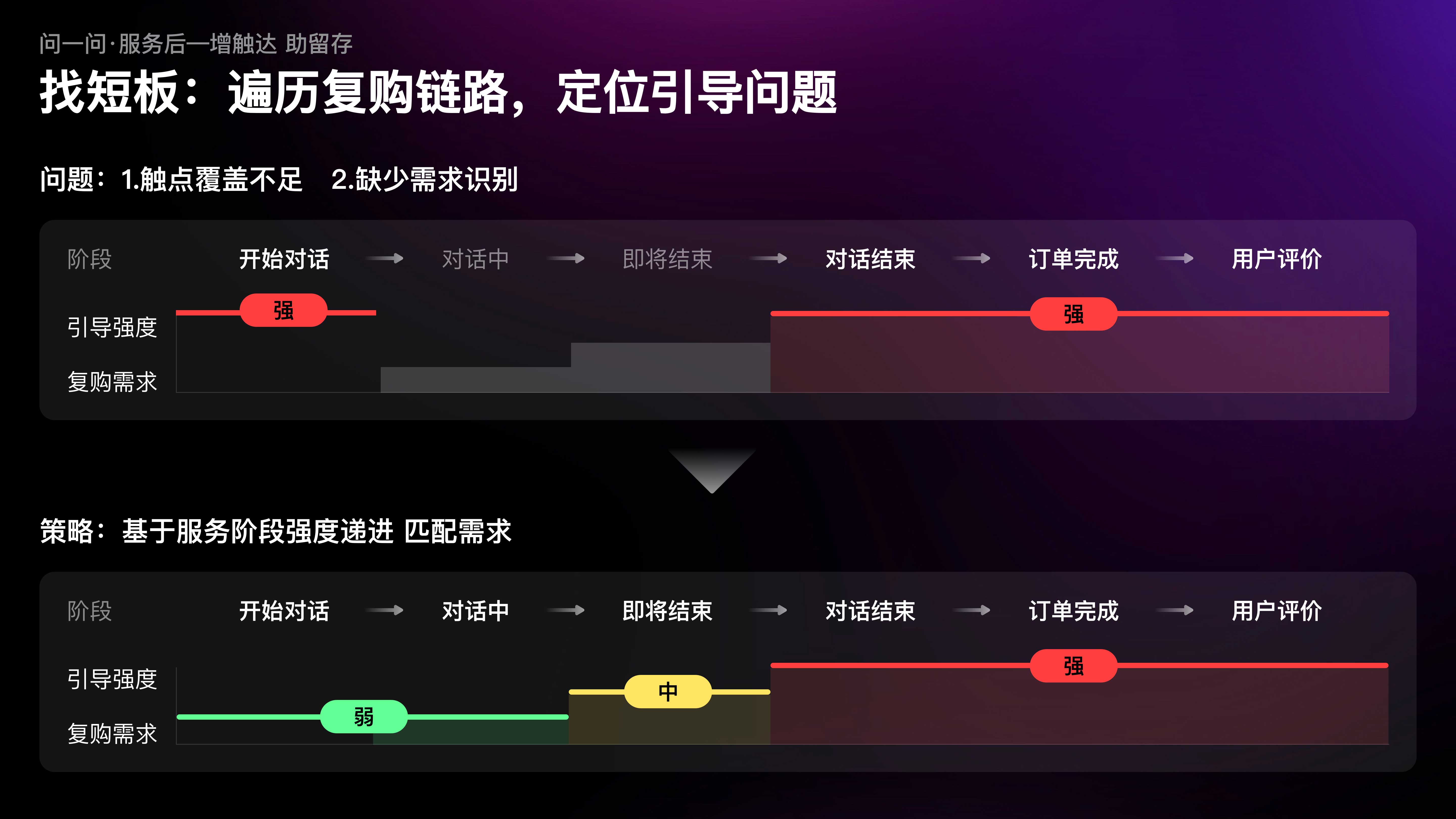 當(dāng)我們以用戶視角,遍歷咨詢鏈路中的復(fù)購引導(dǎo)時,發(fā)現(xiàn)復(fù)購引導(dǎo)的觸點覆蓋不足,且缺少對特定場景下需求的識別,例如在咨詢開始時復(fù)購需求極弱,但設(shè)計引導(dǎo)極強;而在隨后的對話過程中需求漸增,但引導(dǎo)缺失。因此,我們制定了行業(yè)首創(chuàng)的漸進(jìn)式引導(dǎo)策略;隨著服務(wù)推進(jìn),復(fù)購需求漸增,觸達(dá)強度也逐級遞進(jìn)。