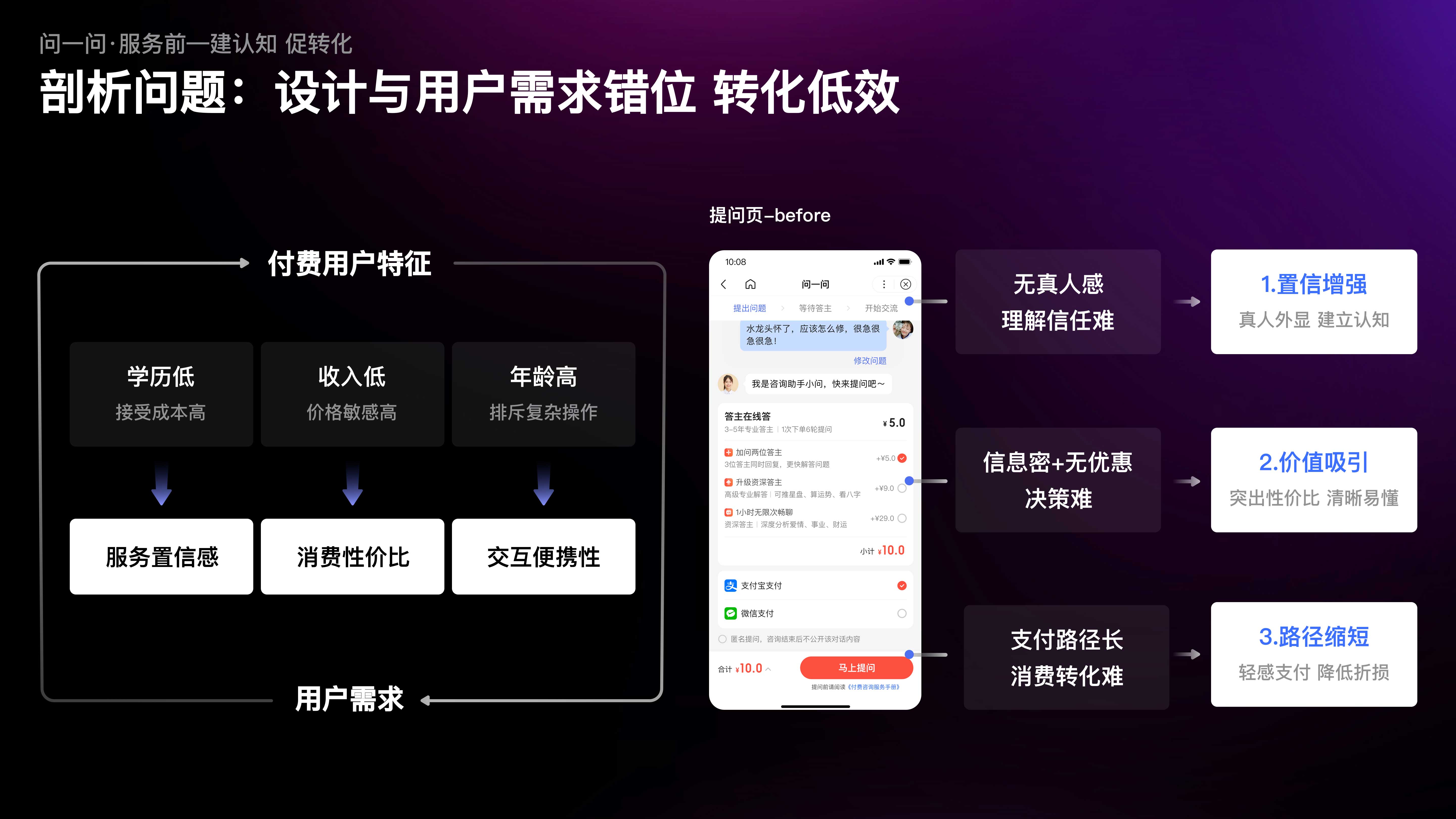 提問是服務(wù)閉環(huán)的起點,也是業(yè)務(wù)的核心創(chuàng)收場景。在舊版提問頁中,服務(wù)價值的傳遞與我們“價格高敏”的主流客群需求發(fā)生錯位,服務(wù)的置信感、吸引力、易用性都有提升空間。因此,在新版方案中,我們通過三大設(shè)計手段綜合解決:前序鋪墊環(huán)節(jié)多點位透傳真人服務(wù)感知,商品選擇環(huán)節(jié)通過突出價值對比和優(yōu)惠感來加速決策,壓縮步長打造輕量支付體驗降低付費焦慮感。