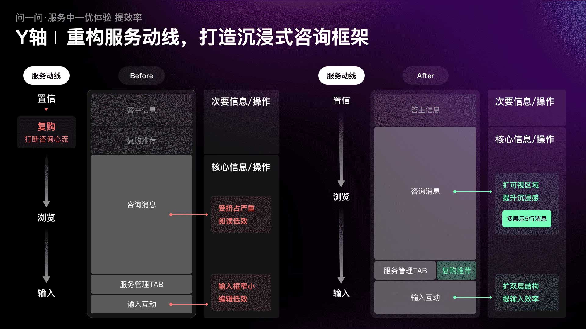 ?到了新的發(fā)展階段,我們的設(shè)計愿景該如何實現(xiàn)?問一問設(shè)計團隊以“服務(wù)體驗”為原點,發(fā)起了C端核心服務(wù)體驗的升級專項。借助用戶觀察、體驗遍歷等方法,沿用戶真實體驗路徑梳理服務(wù)“前-中-后”各階段的關(guān)鍵問題、挖掘優(yōu)化機會。再結(jié)合設(shè)計、體驗雙視角,建立以服務(wù)前“建認(rèn)知、促轉(zhuǎn)化”、服務(wù)中“優(yōu)體驗、提效率”、服務(wù)后“增觸達(dá)、助留存”為核心指導(dǎo)原則的設(shè)計打法。通過切實滿足用戶在服務(wù)各階段需求來激發(fā)持續(xù)消費、讓服務(wù)閉環(huán)順暢運轉(zhuǎn),從而有效地賦能業(yè)務(wù)增長,達(dá)到體驗和收入的雙豐收。