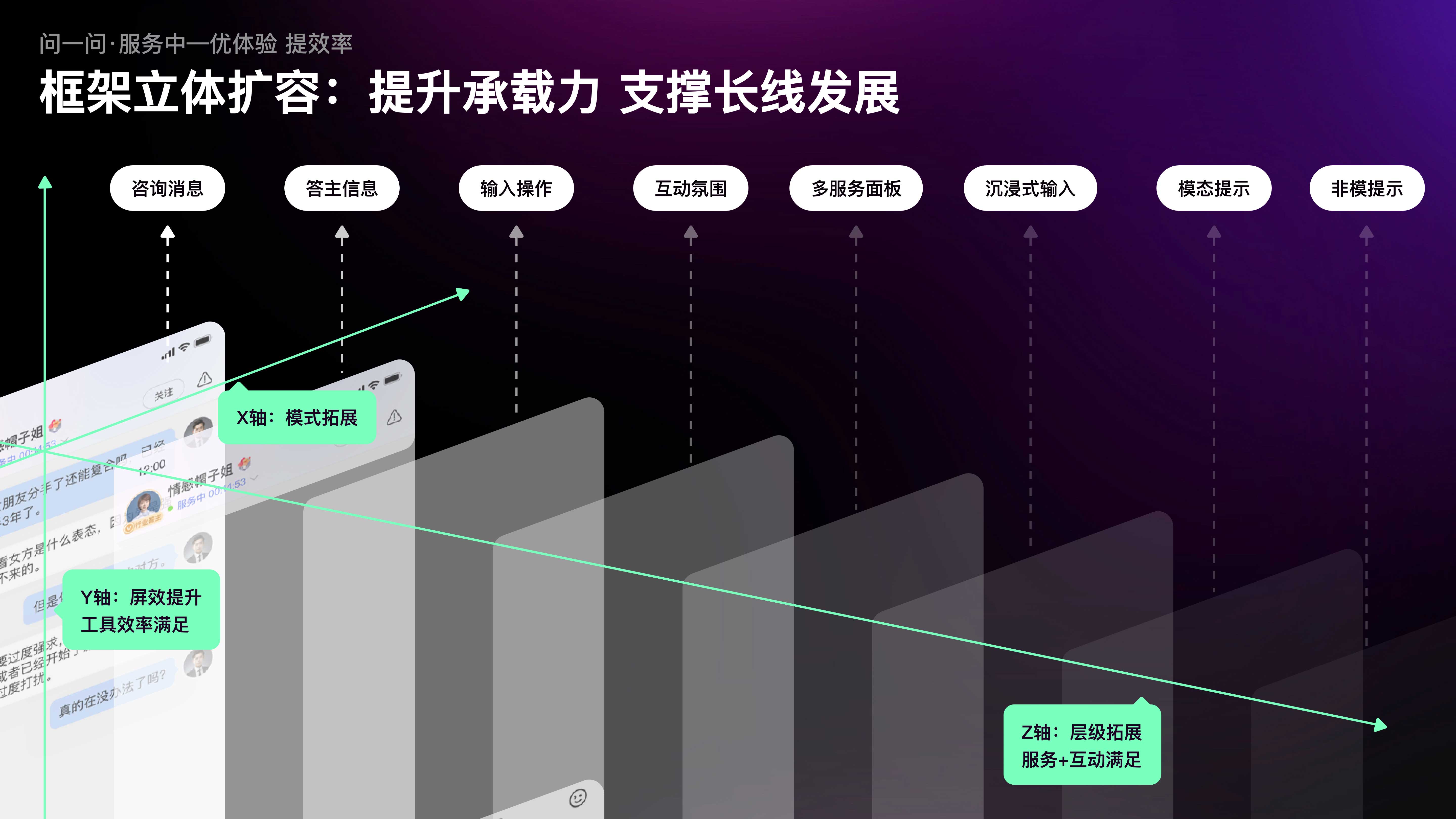 為實現(xiàn)這個目標(biāo),我們突破現(xiàn)有框架,創(chuàng)新制定了沿XYZ軸立體擴容的思路。在Y軸方向上,進(jìn)行了屏效的優(yōu)化,滿足工具提效需求;沿Z軸拓展了層級,滿足多元服務(wù)和互動需求;最后,沿X軸探索第二空間,承載創(chuàng)新型體驗。