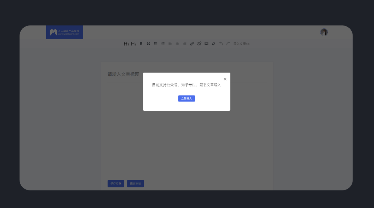 好用的 B 端產(chǎn)品能顯著提升用戶操作效率,讓工作如行云流水般順暢。反之,難用的產(chǎn)品就像用鈍刀切黃油,不僅效率低下,還會讓人心情煩躁。“人人都是產(chǎn)品經(jīng)理” 的文章投稿發(fā)布頁面設置了文章導入功能,支持從公眾號、簡書、知乎專欄導入文章,大大節(jié)省了投稿人編輯文本和排版的時間,減少了重復排版的麻煩,也提高了人們的投稿意愿。