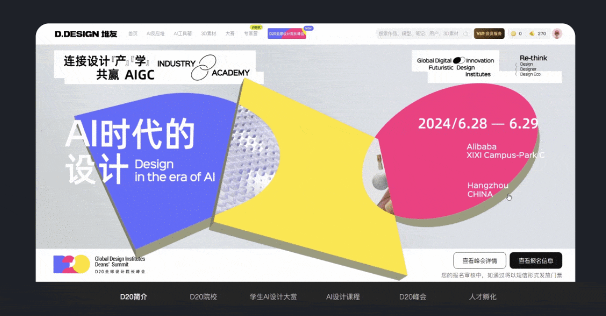 如果 B 端產(chǎn)品缺少體驗設計環(huán)節(jié),其落地呈現(xiàn)的往往只是研發(fā)邏輯,而非用戶需求和心智,無法提供合理的人機交互。體驗設計能打開用戶需求和心智的世界,讓用戶感受到產(chǎn)品是為自己量身定制的。由 Alibaba Design 發(fā)起的 D20 全球設計院長峰會官網(wǎng)首頁設計就很符合用戶心智,畫面簡潔時尚又不失動感,十分耐看。而且人性深處更容易被動態(tài)的事物吸引,下方的導航欄設計也很貼心,在電腦屏幕中完整展示,用戶想查看哪個部分,直接點擊對應的導航欄就能精準跳轉(zhuǎn),無需長時間拖拽。