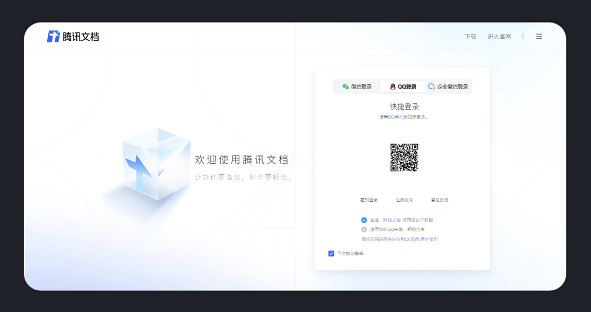 在符合業(yè)務邏輯的基礎(chǔ)上,體驗設計能優(yōu)化 B 端產(chǎn)品復雜的流程,將復雜的迷宮簡化成一條直線,讓用戶操作界面時感到暢通舒適。騰訊文檔的登錄頁沒有讓用戶輸入一連串的賬號和密碼,而是采用二維碼方式,用戶掃碼即可登錄,快捷又方便,大大簡化了登錄流程。