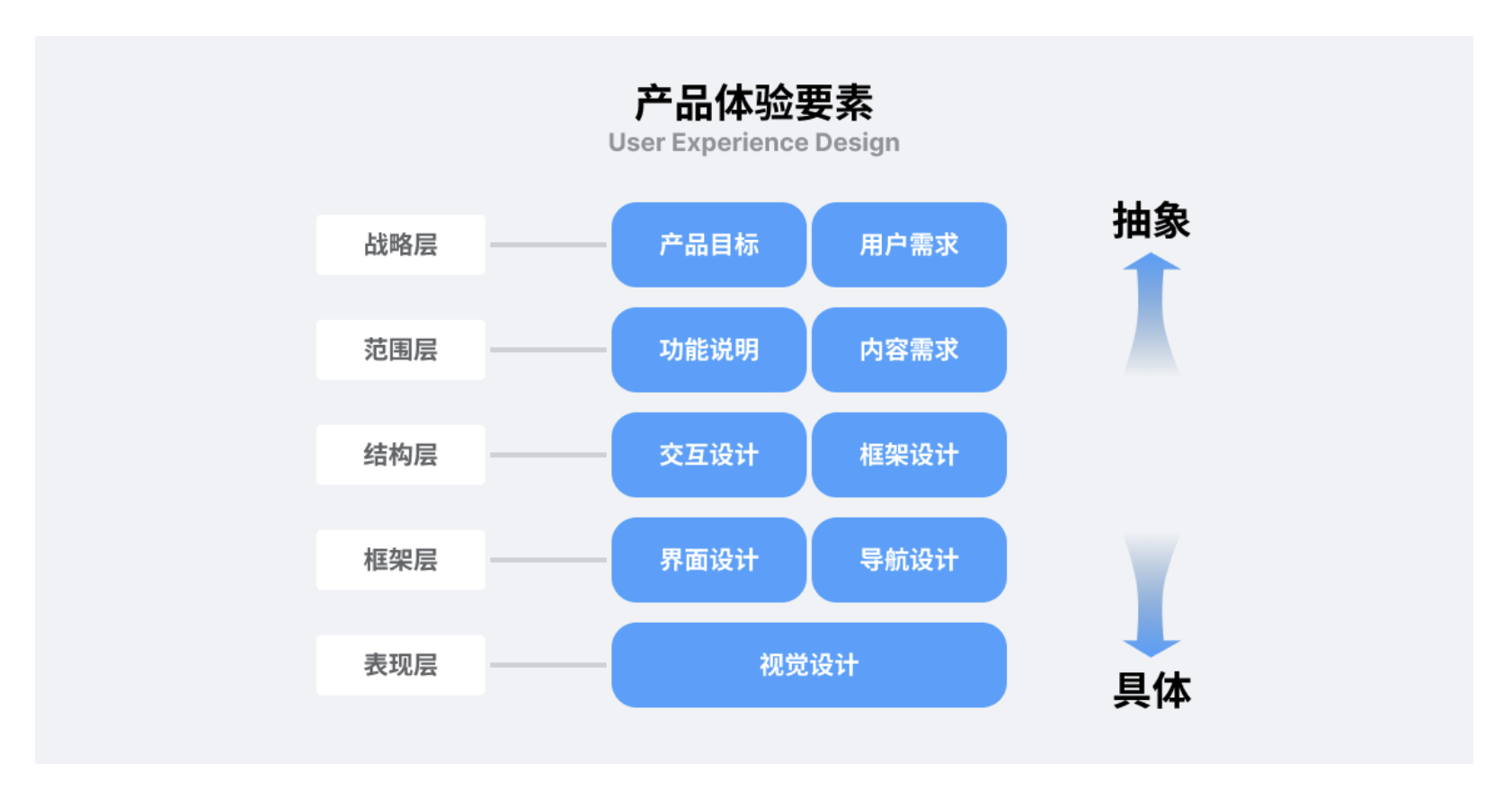 要理解它的核心,繞不開經(jīng)典的產(chǎn)品體驗(yàn)五層級模型。這五個層級從抽象到具體,像搭建一座房子一樣層層遞進(jìn),少了任何一層,體驗(yàn)都會 “塌掉”: