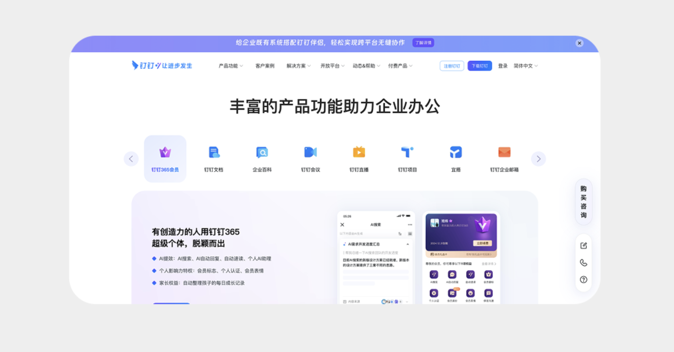 將圖標(biāo)與文字上下排版,搭配圓角矩形背景標(biāo)識(shí)選中狀態(tài),既能提升頁(yè)面豐富度,又能讓用戶快速識(shí)別功能。這種設(shè)計(jì)在工具類、辦公類產(chǎn)品中尤為適用,比如釘釘?shù)墓δ軜?biāo)簽頁(yè),用簡(jiǎn)潔圖標(biāo)搭配 “釘釘文檔”“企業(yè)會(huì)議” 等文字,既清晰傳達(dá)功能,又讓界面更具設(shè)計(jì)感,降低用戶認(rèn)知成本。