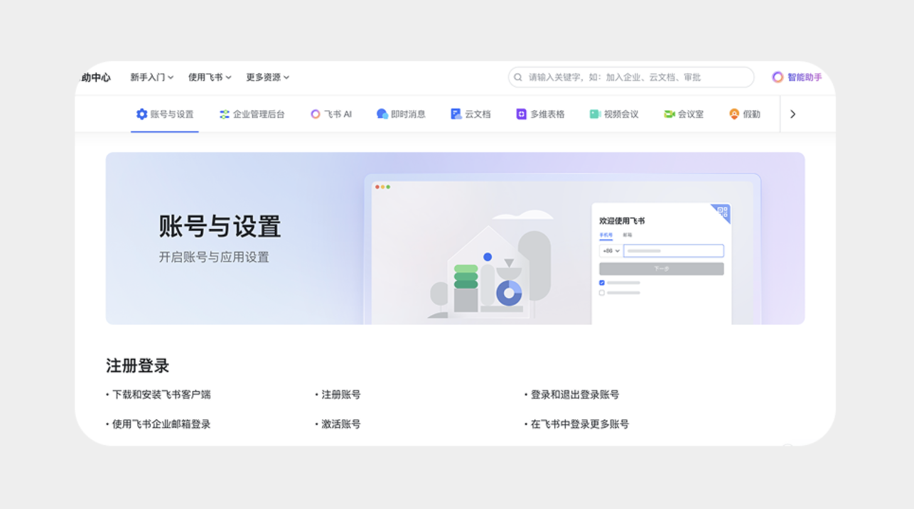 在標(biāo)簽欄兩側(cè)添加左右箭頭,點(diǎn)擊即可展示更多標(biāo)簽,適合功能模塊較多的 B 端產(chǎn)品或網(wǎng)頁(yè)。比如飛書的幫助中心頁(yè)面,標(biāo)簽頁(yè)涵蓋 “智能助手”“云文檔”“視頻會(huì)議” 等多個(gè)功能,通過(guò)左右箭頭切換,既保證界面整潔,又能完整呈現(xiàn)所有選項(xiàng),不影響用戶操作流程。
