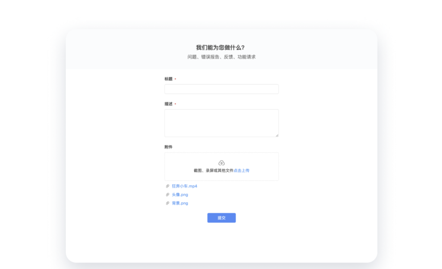 • 附件上傳區域明確標注支持格式(如截圖、錄屏、PDF 等),降低用戶試錯成本;