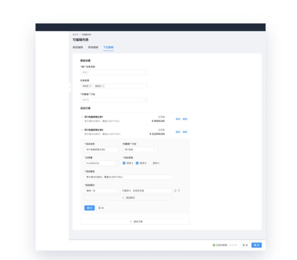 • 適用于需要添加多個對象,且每個對象需配置多組數據的場景(如多活動方案配置、多規則條件設置);