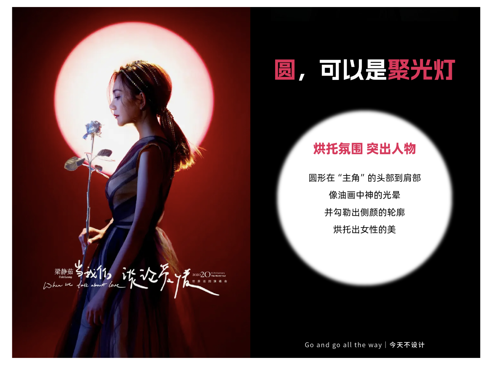 圓形最經(jīng)典的用法之一,是化作 “聚光燈”,在畫面中形成視覺焦點(diǎn),同時(shí)烘托特定氛圍。這種設(shè)計(jì)邏輯源于現(xiàn)實(shí)中的光影體驗(yàn) —— 聚光燈的圓形光束能隔絕干擾,讓觀者注意力瞬間集中于核心主體,海報(bào)設(shè)計(jì)中便借用這一原理,通過圓形光影的明暗對(duì)比、輪廓勾勒,突出人物或關(guān)鍵元素,傳遞情緒基調(diào)。
