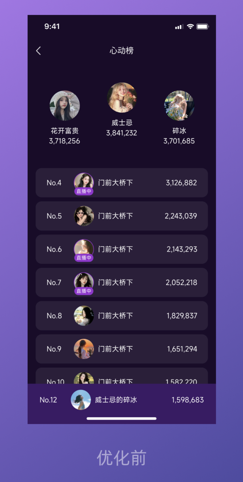 先看看優化前的頁面狀態:整體是簡單的文字羅列,排名、主播名、數值雜亂排布,“直播中” 的文字標識不醒目,前三名與后續排名沒有視覺區分,整個頁面顯得平淡無奇,用戶很難快速捕捉重點,更談不上 “心動” 的視覺體驗。
