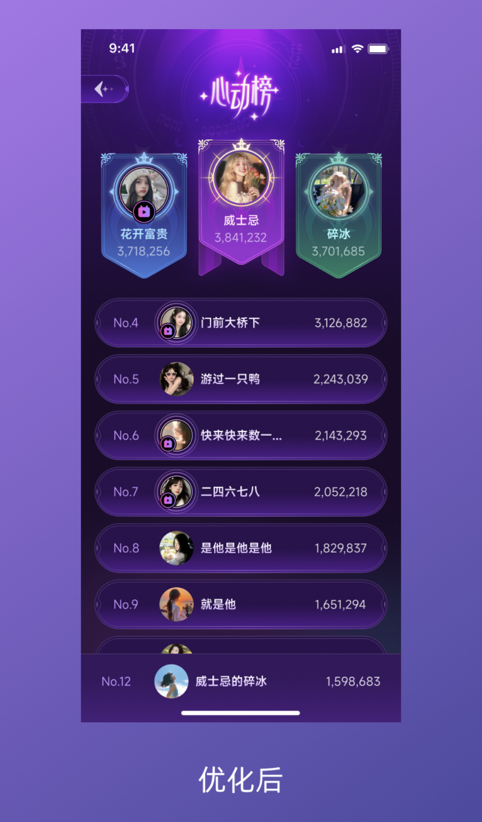 而優化后的頁面完全煥然一新:前三名有了專屬視覺標識,信息層級清晰,主題風格統一,細節處的設計讓普通列表秒升高級感。其實這場 “逆襲” 并非依賴復雜設計,而是抓住了三個核心優化方向,一步步讓界面煥發生機。