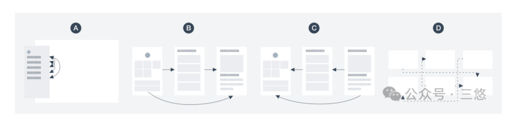 完善的導航體系應支持四種核心路徑移動:同層級跳轉(平移)、進入低層級內容(下鉆)、返回歷史頁面或高層級(返回)、基于相關性推薦(聯想導航),四種路徑相互配合,覆蓋用戶的所有操作場景。