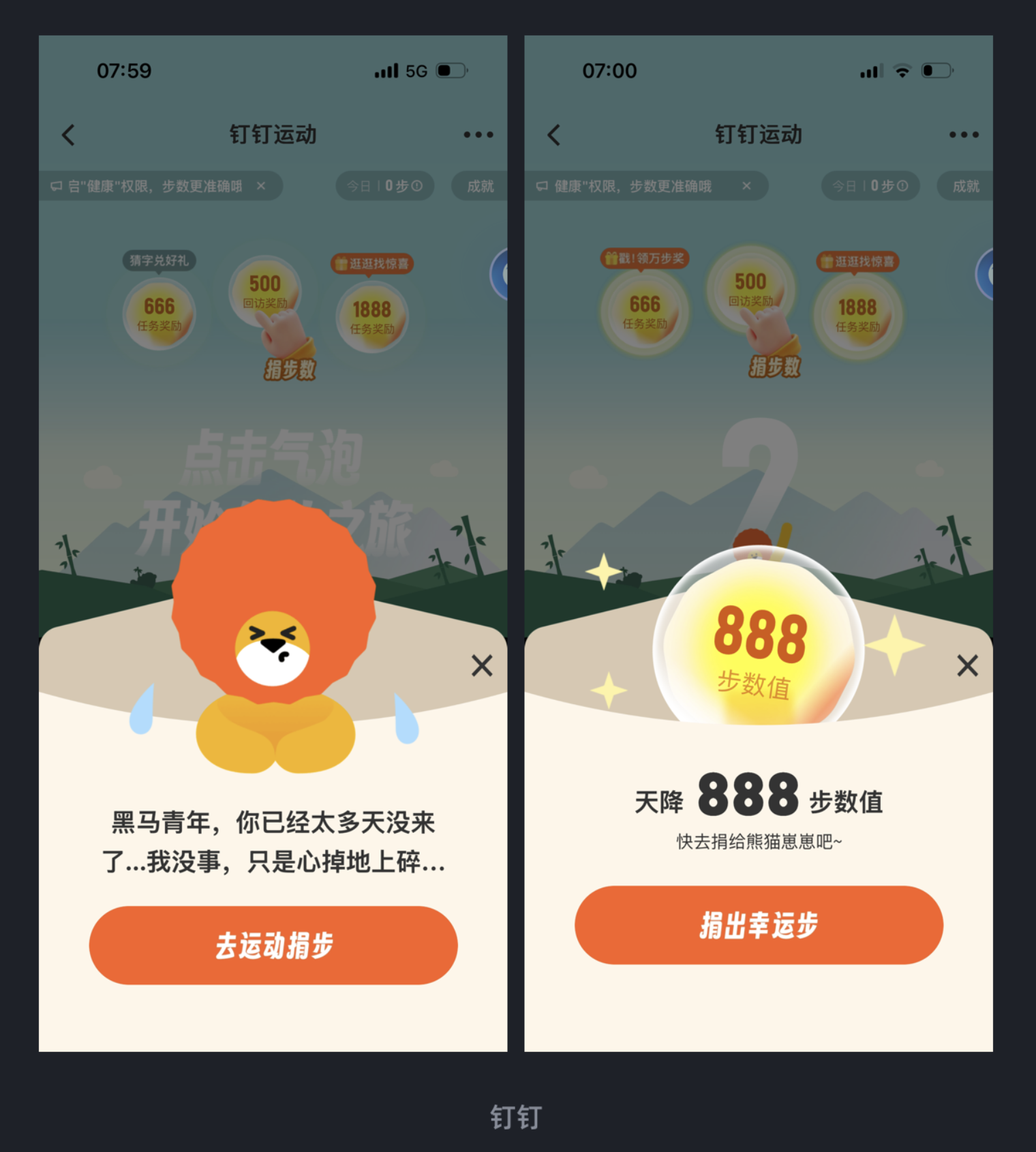 釘釘運動為了激活沉寂用戶參與捐步,采用了極具感染力的文案溝通方式。面對長時間未登錄的用戶,文案以 “黑馬青年,你已經太多天沒來 了... 我沒事,只是心掉地上碎...” 的擬人化表達傳遞失落感,同時結合 “天降幸運步” 的福利機制,讓用戶在情感共鳴與幸運心理的雙重驅動下,主動參與捐步。這種設計跳出了功能型文案的框架,用情感連接用戶,讓產品更具人情味。