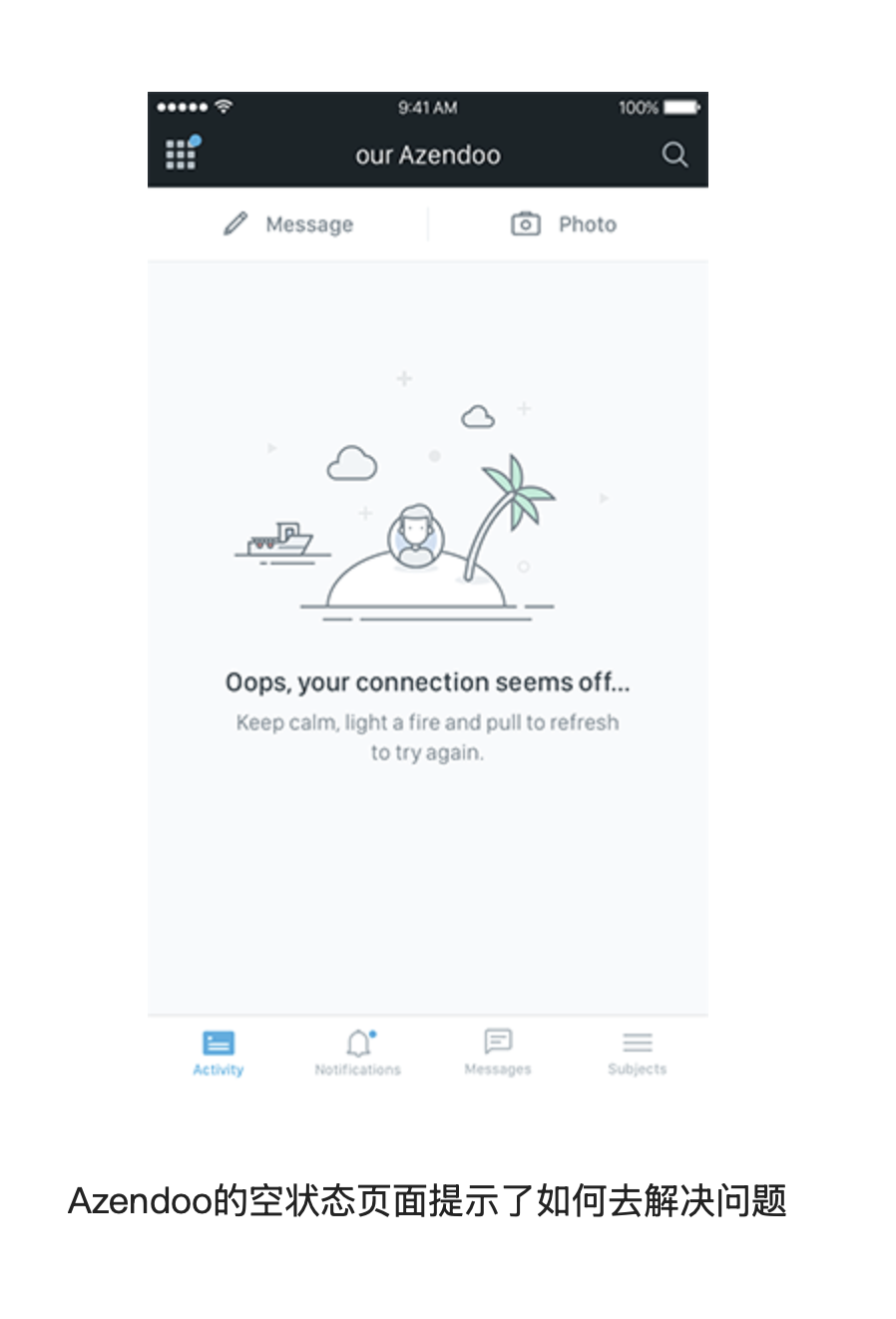 空狀態、錯誤提示頁面不應是毫無指引的空白界面。當用戶遇到網絡斷開、操作失誤或內容為空時,空白頁面會讓用戶不知所措,甚至直接退出 App。優秀的空狀態設計應提供明確的解決方案 —— 比如告知用戶 “網絡連接失敗” 后,給出 “下拉刷新重試” 的指引;內容為空時,建議用戶 “添加第一條內容” 并提供操作入口。某協作類 App 在網絡斷開時,會顯示 “連接似乎中斷了... 冷靜下來,下拉刷新再試一次” 的提示,既緩解了用戶的焦慮,又給出了具體操作路徑,有效降低了用戶流失率。