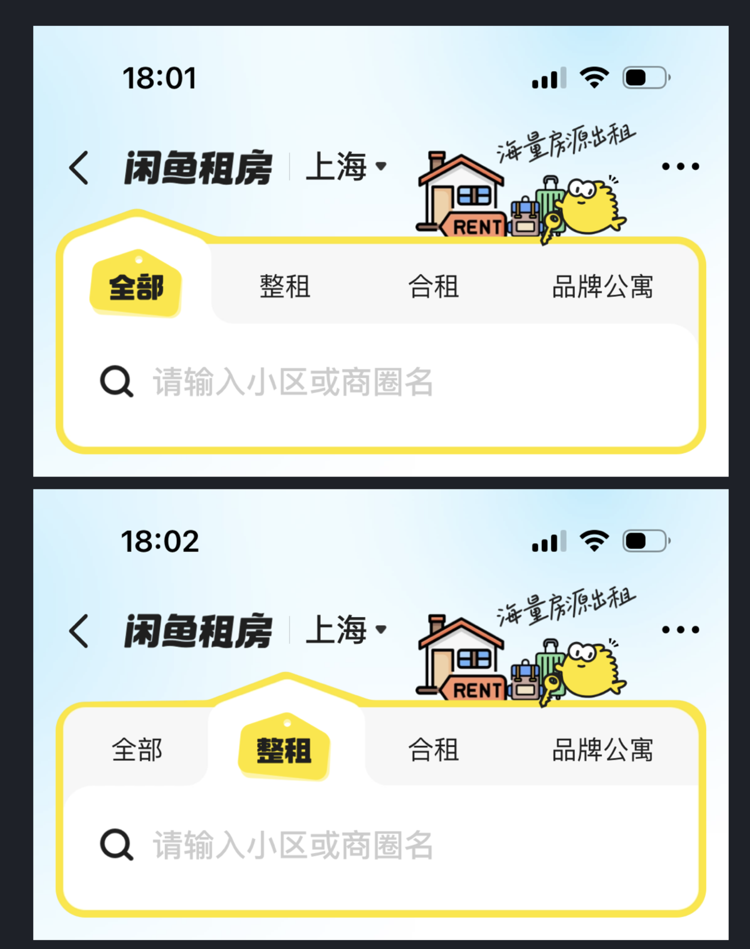 閑魚租房欄目的卡片設(shè)計(jì)便是典型,它摒棄了常規(guī)的矩形卡片框架,將房屋結(jié)構(gòu)的輪廓融入卡片造型,用極簡的幾何圖形還原戶型特征,既貼合租房的業(yè)務(wù)核心,又讓卡片設(shè)計(jì)跳出了同質(zhì)化的視覺桎梏。這種將業(yè)務(wù)特征與視覺設(shè)計(jì)結(jié)合的方式,不僅讓卡片更有辨識度,還能讓用戶一眼感知到功能屬性,實(shí)現(xiàn)了美觀與實(shí)用的雙重效果。