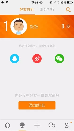 “樂動力”的好友排行頁面,在沒有添加過好友的情況下,該頁面展示了一些社交網(wǎng)絡(luò)的圖標(biāo)和大大的添加按鈕提示用戶可以通過綁定社交賬號來找到更多好友一起PK運(yùn)動量。