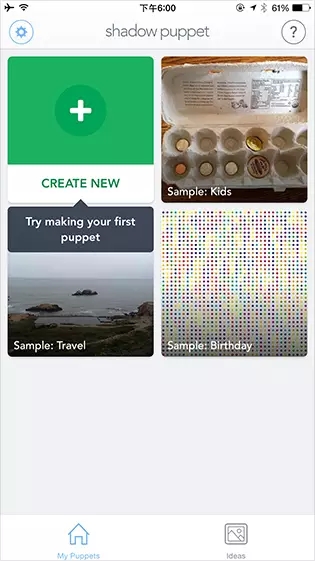 Shadow Puppet可以把照片和視頻剪輯結(jié)合聲音、貼紙等制作成動畫,制作簡單,被譽(yù)為視頻版的PPT。它的首頁預(yù)置了展示用的視頻樣本,用戶可以通過觀看視頻案例對Shadow Puppet的視頻制作有感性的認(rèn)知。