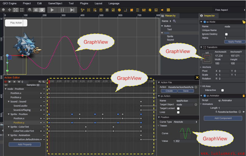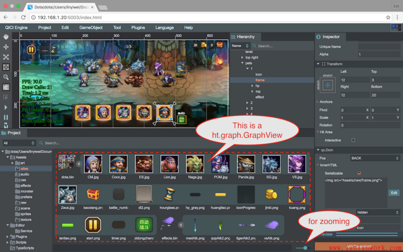 整個 QICI Engine 的 HTML5 游戲引擎編輯工具就是基于 HT 組件定制開發出來的,上圖刀塔場景的資源管理器就是圖標可縮放,圖集可展開合并,可縮小變成樹層次的 GraphView 拓撲圖,而第二張的動作編輯器、曲線編輯器等等部分也都是 GraphView 的身影。