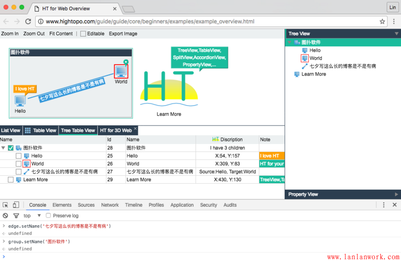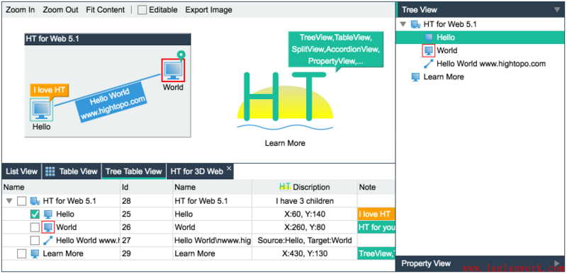 這個例子增加了設置父子關系的代碼,同時有更多的組件(拓撲圖、屬性頁、列表、樹、表格、樹表組件)綁定了同一個數據模型 DataModel,但用戶的代碼依然主要在 Data 和 DataModel 上的操作,這也是 HT 架構設計的優勢,用戶使用更多組件并沒有增加新的學習成本,只要掌握的 DataModel 的基本操作,更多的組件也是如此。