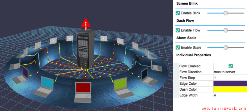構建出拓撲圖后很多人關系的是如何實現動畫,動畫從本質上來說就是在一定的時間點上驅動圖元的參數變化,例如大小、顏色、粗細包括可見不可見等來實現各種動畫效果,而 HT 本來所有圖元都是數據驅動,用戶隨時可以修改 Data 上的任何屬性,因此隨便起個定時器 windwo.setInterval 不斷改變圖元屬性值即可實現動畫效果,但為了方便客戶 HT 還提供了諸多方便函數和插件。