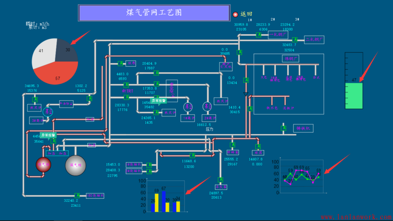 另外 HT 的矢量內置了 Chart 類型,矢量內置的 Chart 不同于傳統獨立的 Chart 組件,傳統的 Chart 是獨立的視圖 DOM 組件,但 HT 的拓撲是 Cavans 方式繪制,因此沒法實現 Chart 組件和普通圖元的不同層次融合顯示,但矢量的 Chart 類型倒是完美的實現了這樣的融合,很多工控應用的客戶會將矢量 Chart 與拓撲圖元素融合一體,可參見《基于HT for Web的Web SCADA工控移動應用》http://www.hightopo.com/blog/... 一文中 HT 的 Web SCADA 應用案例