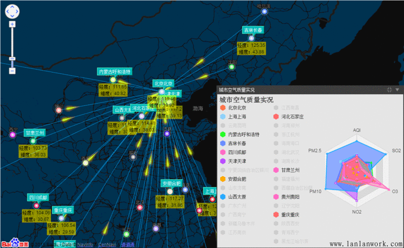 HT 的拓撲圖的節點位置都是邏輯坐標,并非 GIS 的地理信息經緯度坐標,但這并不妨礙 HT 的拓撲圖可以和百度地圖、GoogleMap、OpenLayers 等第三方 GIS 地圖引擎進行整合呈現,參見《百度地圖、ECharts整合HT for Web網絡拓撲圖應用》,該文將 HT 拓撲圖、百度地圖、ECharts、HT 連線流動和面板等插件做了個綜合的呈現展示效果:http://www.hightopo.com/demo/...