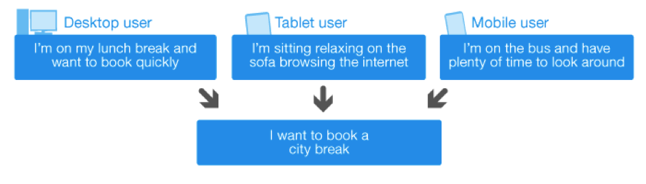過去,我們通常會假設(shè)用戶在使用移動(dòng)設(shè)備訪問網(wǎng)站時(shí),其行為都是高度目標(biāo)驅(qū)動(dòng)化的,例如在旅途中獲取酒店地址、預(yù)訂房間一類。但實(shí)際情況不僅如此——智能手機(jī)、平板電腦等各類移動(dòng)設(shè)備的用戶,會越來越多的在相對穩(wěn)定從容的狀態(tài)下使用網(wǎng)絡(luò)。所以在很多時(shí)候,用戶使用不同設(shè)備的目標(biāo)差別并沒有想象的那么大,我們不能片面的假設(shè)不同類型設(shè)備的用戶對功能的需求差異。
