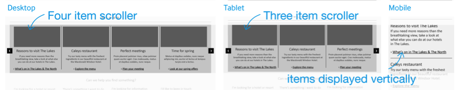 全局的四列等寬網(wǎng)格布局使其他組件的規(guī)劃也非常輕松。在首頁中有一個(gè)組件,其中包含若干內(nèi)容模塊。默認(rèn)尺寸下,可以并排顯示四個(gè)模塊;左右兩邊各有一個(gè)觸發(fā)滾動(dòng)的按鈕,以點(diǎn)擊之后模塊列表會前后滾動(dòng),以顯示更多內(nèi)容。在平板電腦類型的布局中,默認(rèn)顯示的數(shù)量變?yōu)槿齻€(gè);而在手機(jī)的小尺寸屏幕中,內(nèi)容模塊列表會變?yōu)閱瘟校⑷サ袅擞糜谧笥覞L動(dòng)的按鈕,用戶可以上下滾動(dòng)頁面,依次查看不同的模塊。
