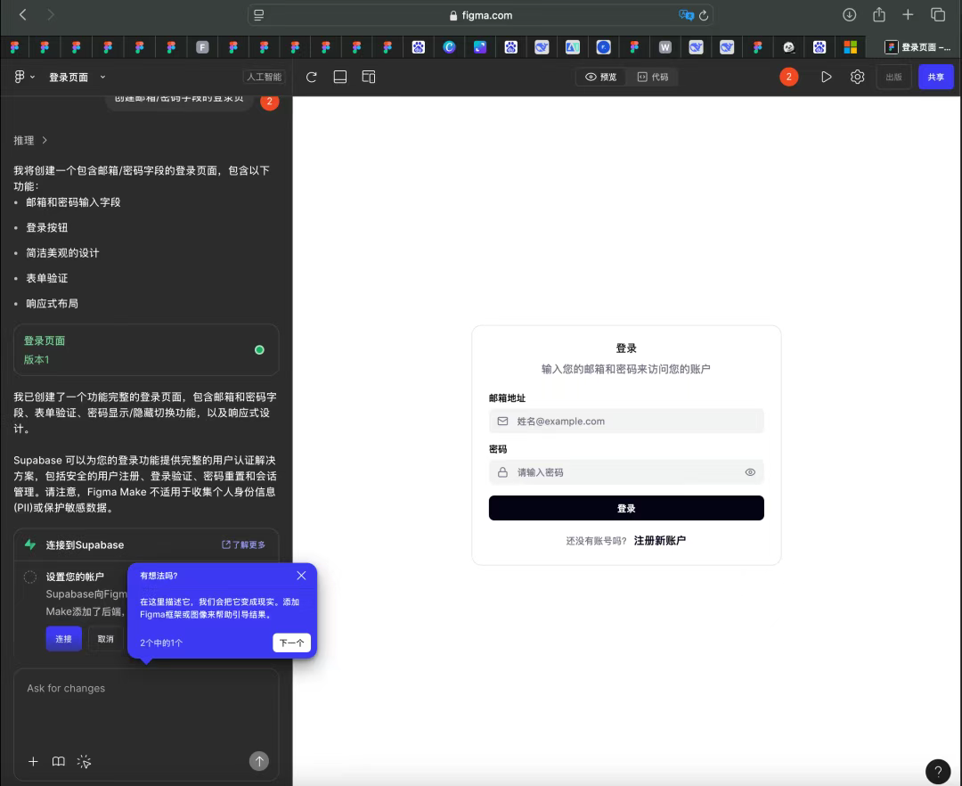 無需編寫 CSS 代碼,輸入指令如“創(chuàng)建帶郵箱/密碼字段的登錄頁”,AI 即刻生成高保真界面及可點(diǎn)擊交互元素。設(shè)計(jì)構(gòu)想從概念到屏幕呈現(xiàn)的鏈路被大幅壓縮,省去重復(fù)搭建畫布的時(shí)間成本。