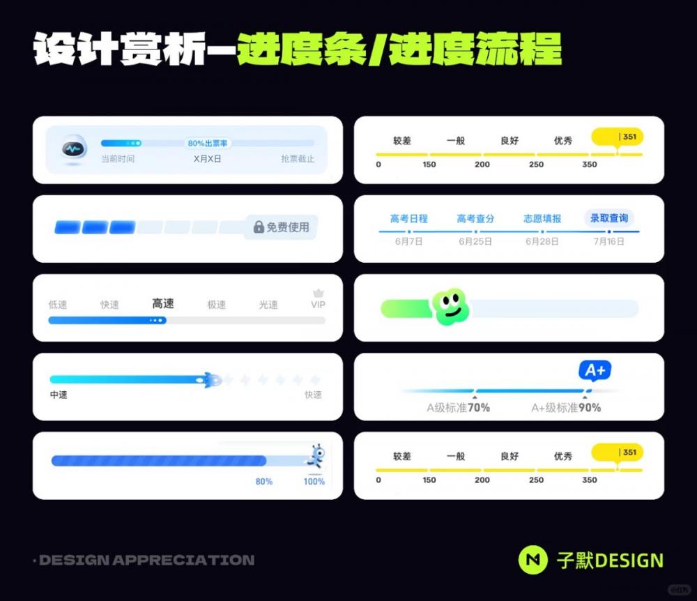 • 設計要點:除了基礎的線性進度條,擬人化的動態進度條(如帶表情的加載動畫)能進一步提升趣味性;而分段式進度條則適合多節點的流程場景,比如 “高考日程” 時間軸。