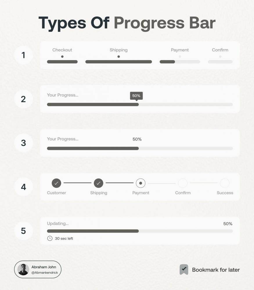 • 場景適配:單目標進度(如完成率、打卡率)用環形,多節點流程(如支付、報名)用分段式線性進度條