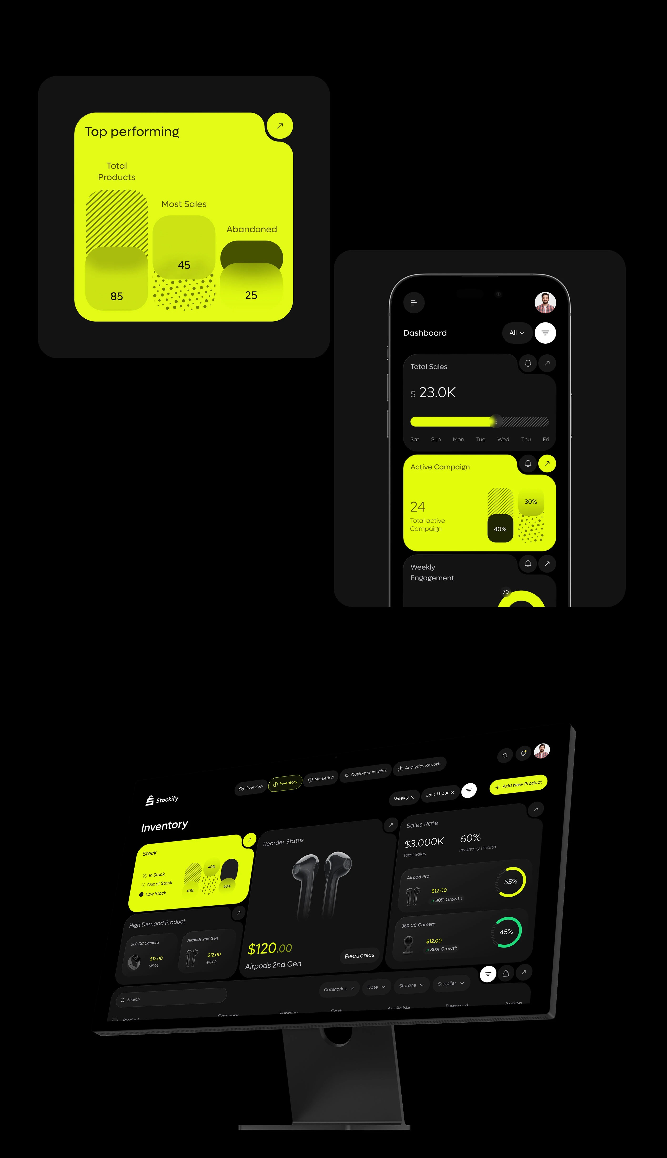 在信息密集的 B 端 SaaS 產品中,如何用清晰、節制而具有未來感的設計,提升用戶的效率和信任感?Stockify 的界面是一個值得研究的參考。一款聚焦 AI 推薦和智能庫存管理的電商 SaaS 工具。這類產品的設計挑戰在于 —— 如何讓用戶信任 AI 決策,并在復雜的信息中快速做出行動。它不是做“好看”的界面,而是通過界面傳達控制感與專業感